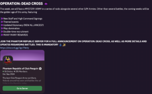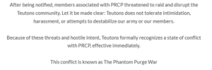 On March 4, 2026, Phantom Republic founder xDemon announced Operation: Dead Cross, described as a series of raids on a “mystery” army. PRCP hosted several events and referred to it as a “temporary unification” with Fire Vikings, Cryo Vanguards, Abyssal Tides, and Phoenix of Club Penguin. On March 7, 2026 (3 days later), the Teutons got to know about a PRCP raid on their event. Hence, they cancelled the event and declared an off-map war on PRCP, beginning the War of the Phantom Purge. In their war declaration post, Teutons leader Justin stated that the army does not tolerate attempts to disrupt the order of their community and hence declared PRCP as an enemy.