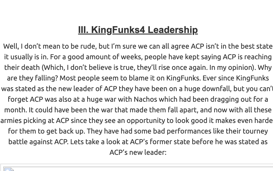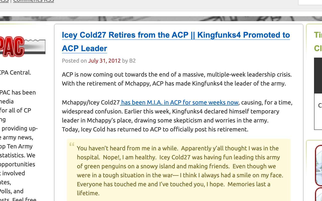 Between 2007 and 2009, the ACP and its coalition with the Rebel Penguin Federation managed to defeat UMA and then subsequently dominate the top ten, almost always being ranked first and rarely dropping below the second spot. The golden age truly hit in 2009, under the leadership of figureheads such as Boomer, as they saw off the threat of the Nachos and Ice Warriors, who had risen significantly. It was at this point I had been recruited on XAT by the Army of CP, and my personal journey to leadership had begun.