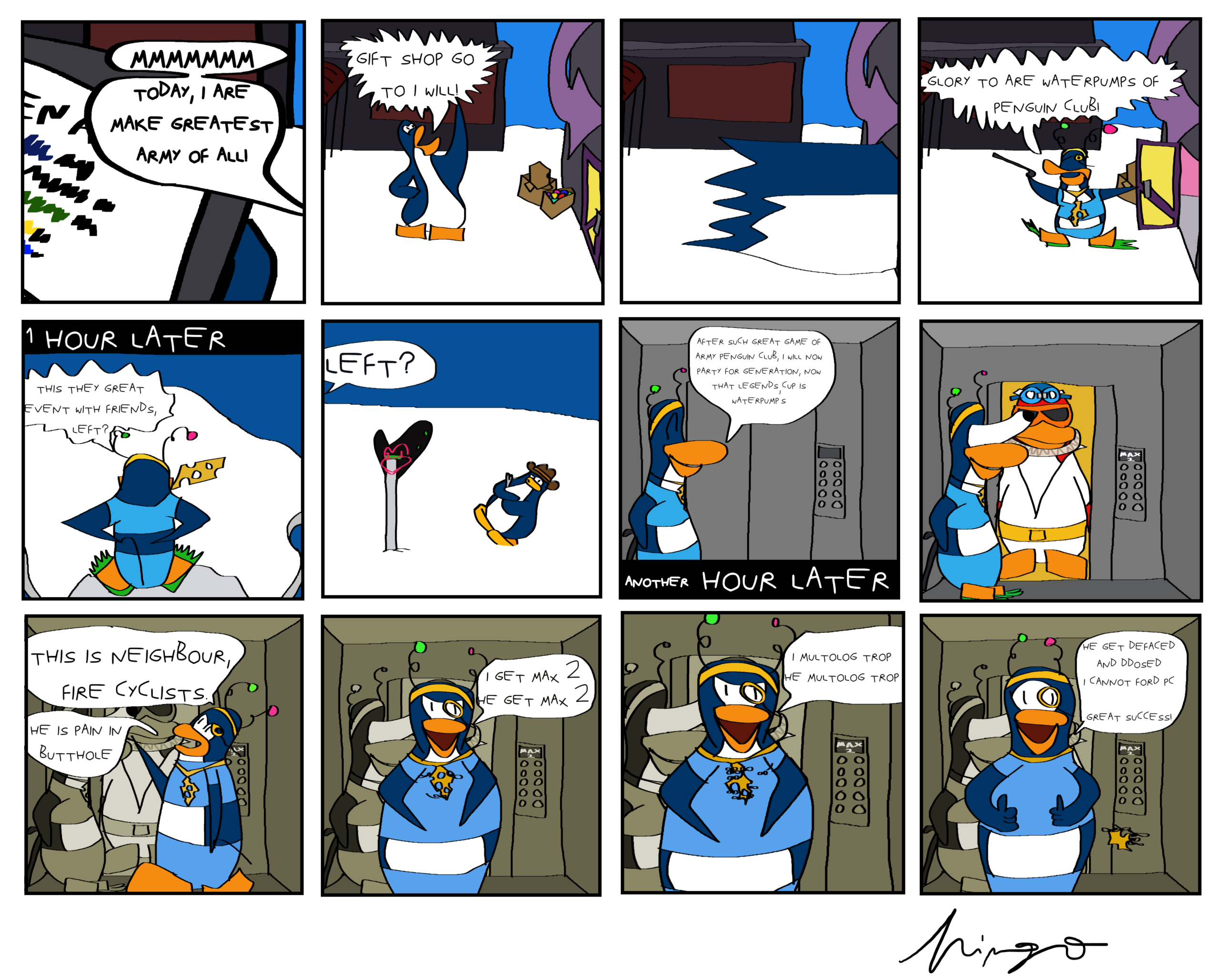 In this comic, Pingo uses many parallels and phrases from the “Borat” movie. A penguin begins a journey to make its own army after looking at the Top Ten. Its first stop is the Gift Shop, looking to find items for its army uniform. Later on, we see the penguin having bought some items and naming its army the “Waterpumps of Penguin Club“.