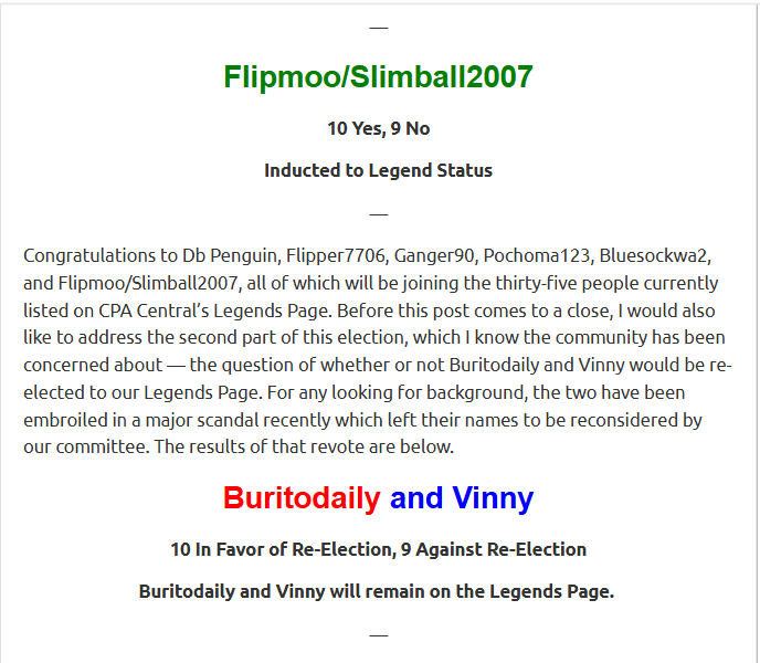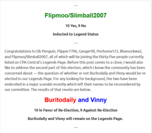 Bluesockwa2 (11-8), and Flipmoo/Slimball2007 (10-9), with the latter two, as well as Flipper7706 and Ganger90, inducted under adjusted or tied vote conditions when applicable regulations permitted admission. Flipper7706 and Ganger90 both received 10-10 splits and were later waived to Legend status. Other important figures, such as Sf1998, Gu Gu Pengu, Kenneth1000, Dreamguitar, Kingfunks4, and Zakster, did not meet the needed threshold, with several earning significant No majorities despite their previous historical significance in the community. In addition to ordinary inductions, the committee held a separate revote on Buritodaily and Vinny’s standing due to previous disagreement. The result of this revote was 10 in favor and 9 against, so both figures remained on the Legends Page.