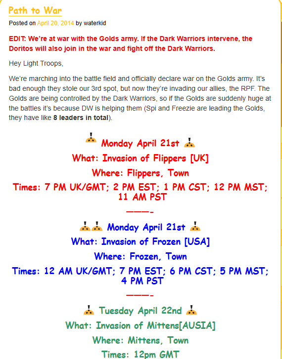 In response, the Light Troops, ranked fourth on CPAC at the time, declared war on the Golds, escalating the situation into a broader conflict involving multiple armies and shifting alliances. The Light Troops formally issued their statement on April 20, 2014, in which they outlined both their justification for the war and a detailed invasion schedule. The LT leadership stated that Golds surpassed them in CPAC standings and targeted their allies, including the Rebel Penguin Federation, as key reasons for the declaration.