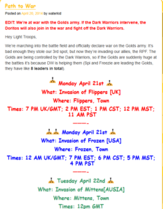The LT post also claimed that the Golds operated under the influence of the Dark Warriors and raised concerns about their leadership structure, specifically referencing Spi and Freezie as central figures within a multi-leader system. The invasion schedule listed coordinated attacks across several servers, including Flippers, Frozen, Mittens, Sherbert, Snow Flake, Slippers, Ice Bound, and Fog, spanning UK, USA, and AUSIA divisions between April 21 and April 25. This plan demonstrated a structured, multi-day offensive campaign.