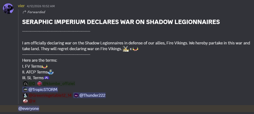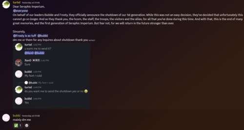 The Seraphic Imperium would later announce its reopening on April 11. Not too long after, army leader Vier would announce its alliance with the Fire Vikings, reverting to another announcement towards a declaration of war against the Shadow Legionnaires.
