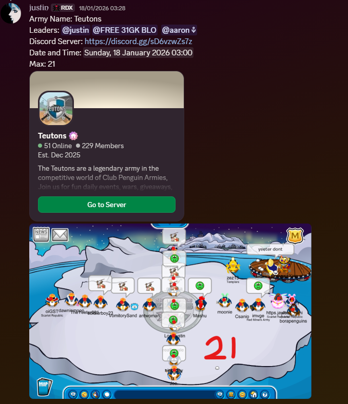 The proper format for officialising your army in the Club Penguin Armies league is pinned in the #opening-events channel. Here’s the format for your reference, and an example of a successful registration: