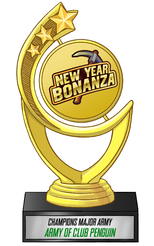 The first iteration of New Year Bonanza held by Club Penguin Armies. New Year Bonanza is an ultimate battle royale where multiple battles take place on one server. This served as inspiration to Candy Crusher Brawl and Trick or Treat: Trials. This unique battle server format sees each army fighting for 30 minutes across three different battle rooms, encountering different armies in each of the rooms. However, the twist is that no army will know exactly who they are up against until the moment they enter the room. Major and S/M armies competed separately.